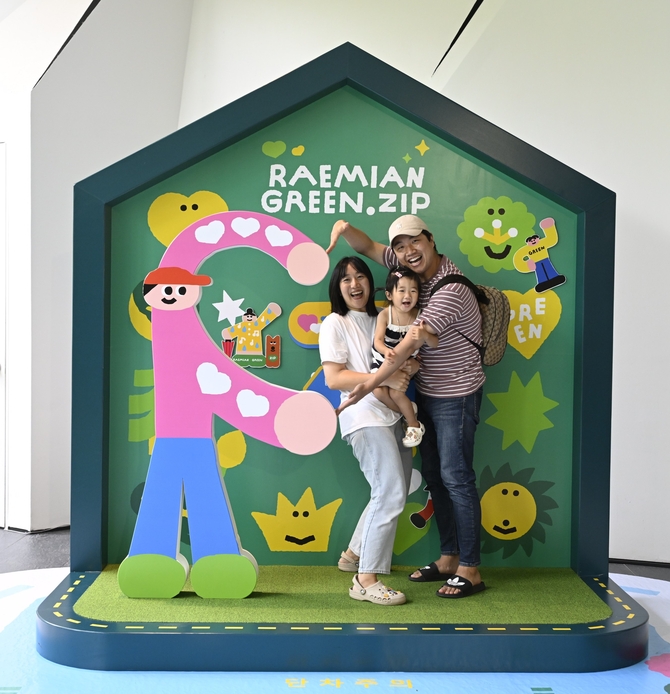 시즌 전시 <RAEMIAN GREEN.ZIP>은 깨끗한 세상을 만들어가는 소통을 독려하는 체험형 전시로, 일러스트 작가와 협업해 공간을 구현했다. 래미안이 그리는 녹색(GREEN) 세상 주제의 전시를 곳곳에서 볼 수 있는데, 1층 전시 라운지의‘그린 빌리지’는 환경을 생각하는 캐릭터들이 모인 마을로 조성된 공간이다. 그린 빌리지 옆에서는 본인이 추구하는 환경 실천 메시지로 포토존을 직접 꾸밀 수도 있다. 모든 전시 요소는 환경에 대해 고객의 직접적인 실천과 소통을 추구한다.