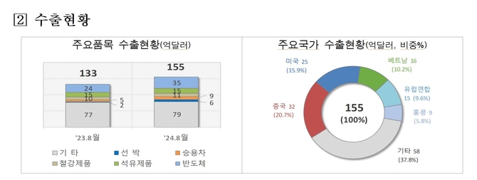 관세청에 따르면 수출 주요품목은 반도체(42.1%), 석유제품(5.5%) 승용차(63.9%) 등은 증가했으나, 정밀기기(-10.6%) 등은 감소했다.
