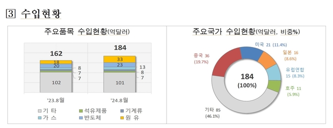 수입 주요국가는 중국(5.0%), 미국(16.0%), 일본(17.2%), 호주(34.8%) 등 증가했으며, 유럽연합(-0.7%) 등 감소했다.