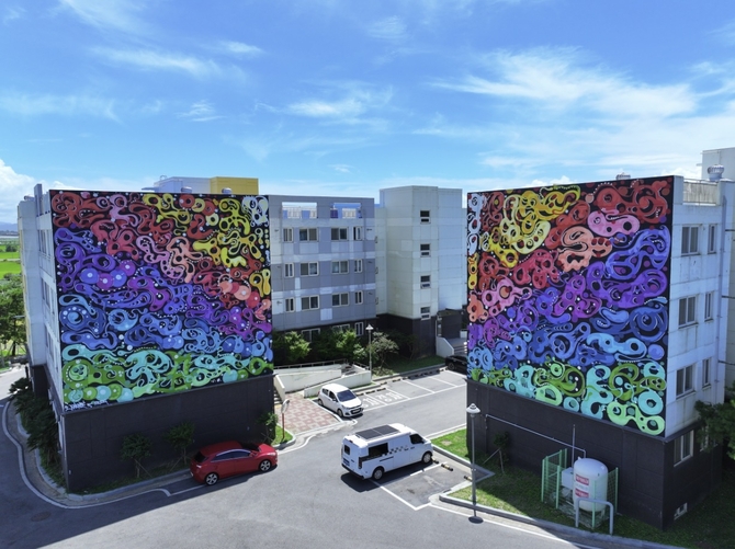 또한, 존원은 프랑스 최고 영예인 레지옹 도뇌르(Ordre national de la Légion d’honneur) 문화예술훈장을 수상한 이력이 있는 유명 아티스트다. 압해읍 팰리스파크 아파트의 좌우 대칭 구조를 나비의 대칭적인 형상과 연결해 건물과 자연의 조화를 강조하며, 무지개 색상을 활용해 주거 공간에 활기와 생동감을 불어넣는 데 중점을 두었다. 이를 통해 다양한 색의 조화와 통합 메시지를 전달하며, 나비의 역동적인 날갯짓을 표현했다.