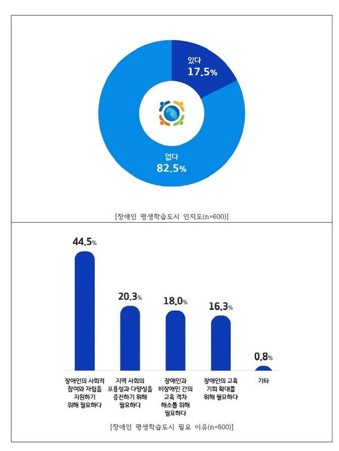 반면 조사 결과 응답자의 17.5%만이 장애인 평생학습도시에 대해 들어온 적이 있다고 답했다. 특히 주변에 장애가 있는 응답자 중 27.6%가 장애인 평생학습도시에 대해 인지하고 있었던 반면, 비장애인의 경우는 해당 개념에 대한 인지율은 15.4%에 그쳤다.