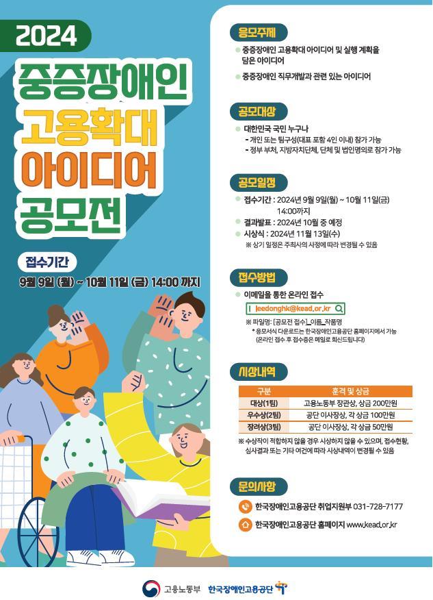 (조세금융신문=최주현 기자) 고용노동부와 한국장애인고용공단은 국민이 체감할 수 있는 장애인 고용정책을 마련하기 위해 '중증장애인 고용 확대 아이디어 공모전'을 9일부터 내달 11일까지 개최한다.