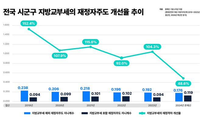 교부세로 인한 재정자주도 지나계수 개선율도 2019년 152.4%에서 2023년 104.3%로 48.6%나 내려갔다.