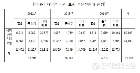 7일 국회 정무위원회 소속 민병두 의원(새정치민주연합)이 금융감독원으로부터 제출받은 ‘비대면 채널을 통한 보험 불완전판매 현황 자료’를 분석한 결과, 2012년부터 2014년까지 비대면 채널을 통한 보험 불완전판매는 12만4천206건으로 집계됐다.