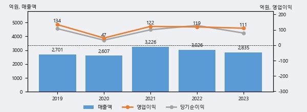 대영포장의 2023년 매출액은 전년대비 -6.3% 줄어든 2835억원이고, 영업이익 역시 전년대비 -7.0% 줄어든 111억원을 기록했다. 이 회사의 매출액 증감률과 영업이익 증감률은 각각 코스피 하위 33%, 하위 46%에 해당된다.