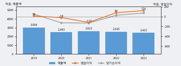 우신시스템의 2023년 매출액은 전년대비 -4.8% 줄어든 2422억원이고, 영업이익은 전년대비 55.7% 늘어난 124억원을 기록했다. 이 회사의 매출액 증감률과 영업이익 증감률은 각각 코스피 하위 37%, 상위 25%에 해당된다.