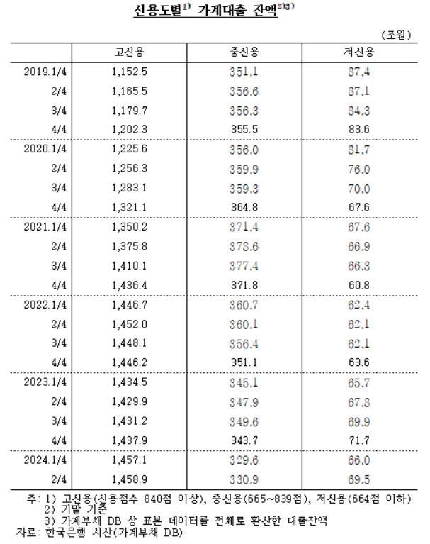 14일 한국은행이 국회 기획재정위원회 소속 박성훈 의원(국민의힘)에게 제출한 자료에 따르면, 올해 상반기 말 신용 점수 840점 이상의 고신용자 가계대출 잔액은 총 1천458조9천억원으로 집계됐다.