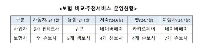 비교추천서비스는 1월에 쿠콘이 5개 생명보험사와 용종보험을, 6월에는 네이버페이가 4개 생명보험사와 저축보험을, 7월에는 7개 손해보험사와 여행자보험을 각각 출시했지만, 출시 회사는 단수에 그쳤다.