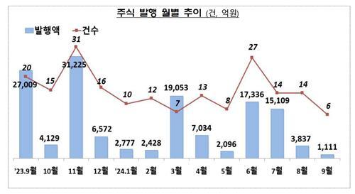 반면 주식 발행규모는 지난달 1천111억원으로 전월보다 2천726억원(71.0%) 감소했다.