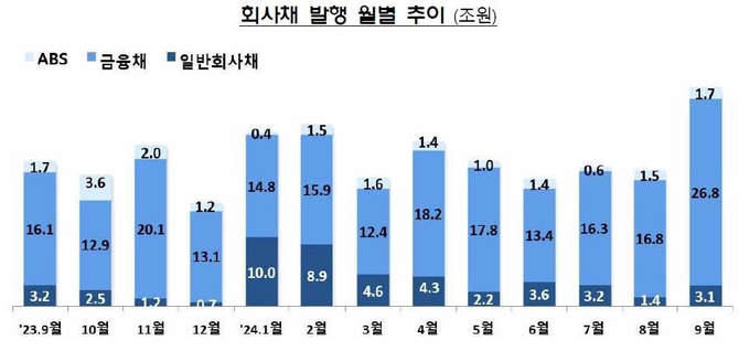 종류별로 보면 일반회사채는 9월에 3조710억원 어치가 발행돼 전월보다 1조6천740억원(119.8%) 급증했다. 이중 A등급 이하 비우량물은 주요국의 금리 인하 등으로 위험 회피 성향이 완화하면서 발행 비중이 8월 22.5%에서 9월 28.5%로 확대됐다.