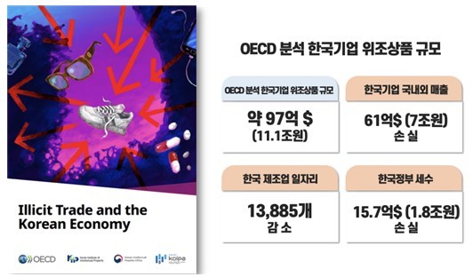 OECD의 발표에 따르면 한국기업의 위조상품으로 인한 국내외 매출 손실은 7조원에 달하고, 위조상품으로 인해 한국 제조업 일자리가 약 1,400개 가량 감소하였으며, 한국정부의 세수 또한 위조상품으로 인해 약 1.8조원 가량의 손실이 발생하였다고 한다.