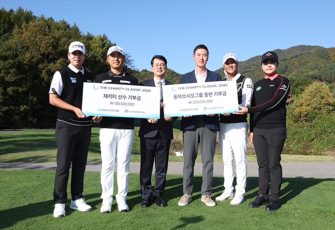 기부금 전달식에는 더채리티클래식 2024 초대 챔피언인 조우영 선수를 비롯해 주요 상위 입상 선수인 허인회, 김민규, 장유빈과 서선원 한국백혈병어린이재단 사무총장과 동아쏘시오그룹 관계자들이 참여했다.