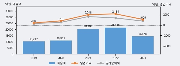 대한제강은 2023년 매출액 1조 4478억원과 영업이익 1099억원을 기록했다. 전년대비 매출은 -32.4%, 영업이익은 -49.0% 각각 하락했다. 이 회사의 매출액 증감률과 영업이익 증감률은 각각 코스피 하위 4%, 하위 25%에 해당된다.
