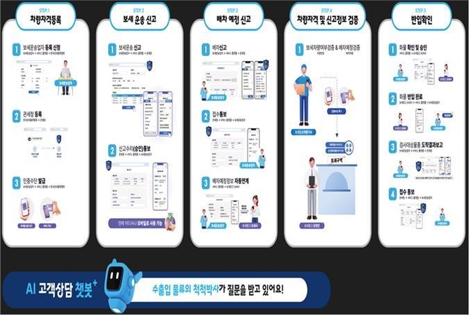 '보세운송 세관신고', '반·출입 관리', '보세운송 전용 AI 챗봇' 등을 추가로 개발해 차량 등록부터 운송 신고, 배차, 반입 절차까지 종이 문서 없이 언제 어디서나 컴퓨터와 스마트폰으로 간편하게 처리할 수 있도록 서비스를 고도화했다.