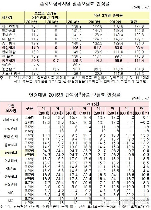 특히 AIG손보의 경우 2014년 손해율이 89.5%를 기록하자, 보험료를 7.5%를 인하한 반면, 삼성화재의 평균 손해율은 93.4%로 유일하게 100%를 넘지 않지만 보험료 인상률은 두 번째로 높고, 농협손보의 경우에도 손해율이 2013년 99.3%, 2014년 92.1%로 감소했음에도 보험료는 7.1% 인상하였다.