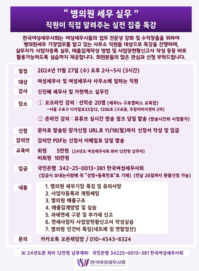 (조세금융신문=김영기 기자) 한국여성세무사회(회장 황영순)가 오는 27일 서울 구로동 소재 ‘세무tv 구로캠퍼스 교육장’에서 여성세무사 및 회원사무소 직원을 대상으로 ‘병의원 세무실무’ 특강을 개최한다.