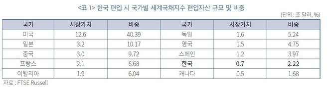 세계국채지수를 추종하는 세계 자금 규모는 시장에서 2조5천억달러 안팎으로 추정되는데, 이를 기준으로 편입 과정에서 우리나라에 500억∼600억달러에 이르는 외국인 채권 투자 자금이 흘러들 것으로 금융연은 분석했다.