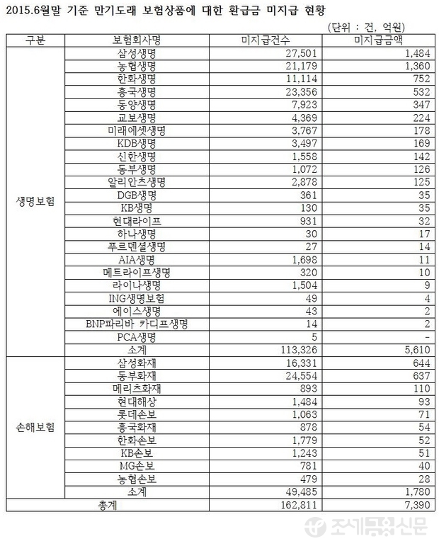 (조세금융신문=김사선 기자) 올해 6월말 기준, 국내 보험사들의 만기도래 보험상품에 대한 환급금 미지급현황이 건수로는 162,811건에 금액으로는 7,390억원에 달하고 있는 것으로 나타났다.