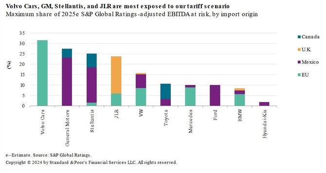 S&P글로벌은 보고서에서 트럼프 당선인이 최근 발표한 캐나다와 멕시코에 대한 25% 관세 부과에 더해 유럽 및 영국에서 수입되는 소형차(light vehicle· 중량 7천500kg 이하의 승객/화물용 차량)에 20%를 관세를 매길 경우 유럽 및 미국의 자동차 업체의 EBITDA(세금, 이자, 감가상각비를 차감하기 전의 순이익)가 최대 17%가 줄어들 수 있다고 밝혔다.