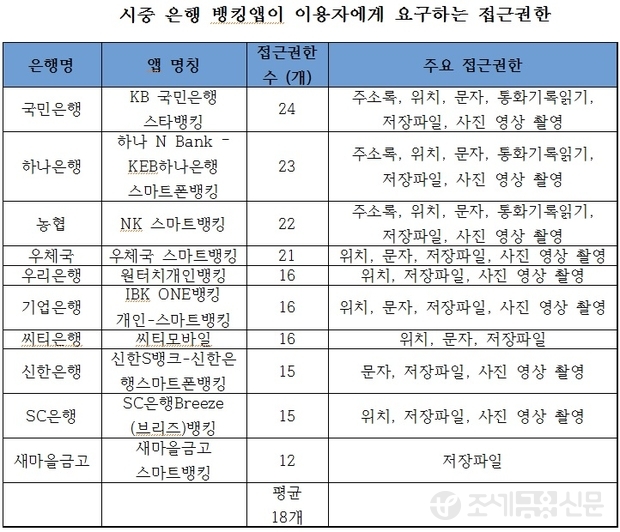 정무위원회의 금융위원회 대상 국정감사에서 새정치민주연합 김기식 의원에 따르면 시중 10개 은행의 스마트폰 뱅킹 앱은, 고객의 휴대전화에 대한 접근권한을 평균 18개 요구하고 있는 것으로 나타났다.
