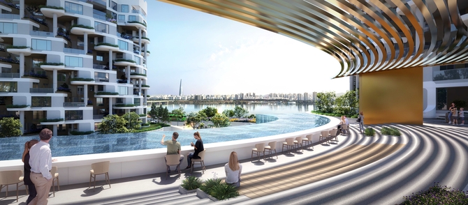 각각의 중앙광장을 주변 환경과 어우러진 테마를 부여한다. 한강에 인접한 블록은 '물의 정원'을 콘셉트로 유려한 곡선의 수경 시설을 조성할 방침이다. 여기에 원형 타워의 디자인 모티브인 수련을 테마로한 물놀이터와 계절마다 변화하는 다채로운 꽃의 향연을 느낄 수 있는 예술 정원을 선보인다.