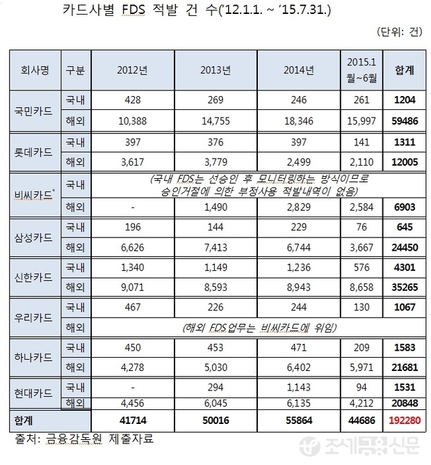 이 의원이 2012년부터 2015년 6월까지 8개 카드회사 FDS 시스템 적발 내역을 분석한 결과, 불법 복제카드 결제 시도 횟수는 해가 갈수록 증가하는 것으로 나타났다.
