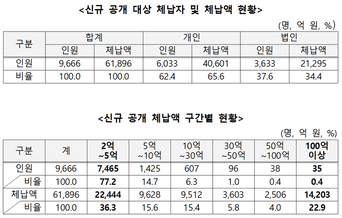 올해 신규 공개 대상자는 개인 6033명, 체납세금 4조601억원이며, 법인은 3633개, 체납세금 2조1295억원이다. 이들의 총 체납액은 6조1896억원이다.