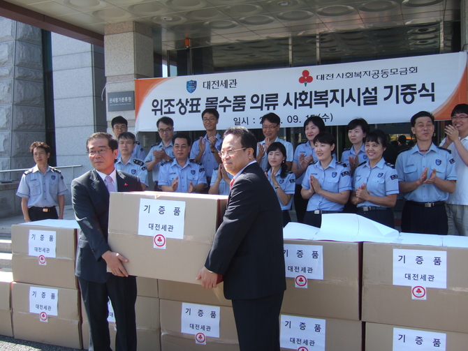 대전세관(세관장 최환조)은 불법으로 수입한 상표법 위반물품(짝퉁) 유아용 방한복 등 3410점(약 1억 7천 8백만원 상당)을 대전광역시 사회복지공동모금회에 기증키로 하고 지난 2010년 9월 15일 전달식을 가졌다.