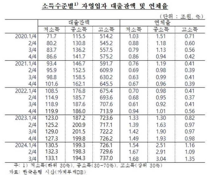 한은 관계자는 "모든 소득 구간에서 저신용자 수가 늘고 있고, 이는 고소득 자영업자도 마찬가지"라며 "중소득 자영업자는 연체 차주 수 비중이 다른 소득 구간보다 높아 연체율도 더 높게 나타났다"고 설명했다.