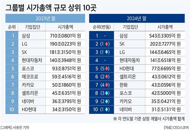 시총 순위에서도 SK그룹은 2023년 말 3위에서 2024년 말 2위로 올라섰고. 2위였던 LG그룹은 3위로 밀려났다.