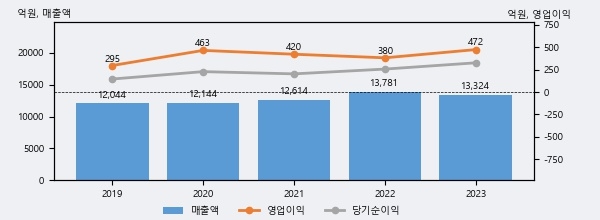 대한제당의 2023년 매출액은 1조 3324억으로 전년대비 -3.3% 하락했고, 영업이익은 472억으로 전년대비 24.1% 상승했다. 이 회사의 매출액 증감률과 영업이익 증감률은 각각 코스피 하위 41%, 상위 37%에 해당된다.