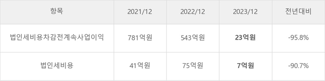 테스의 지난 3년 동안 법인세 납부액 추이를 보면 2022년에는 증가했으나, 작년에는 7억원으로 크게 감소했다.