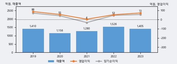 부산산업은 2023년 매출액 1405억원과 영업이익 72억원을 기록했다. 전년대비 매출은 -7.9% 하락했고, 영업이익은 35.9% 상승했다. 이 회사의 매출액 증감률과 영업이익 증감률은 각각 코스피 하위 29%, 상위 32%에 해당된다.