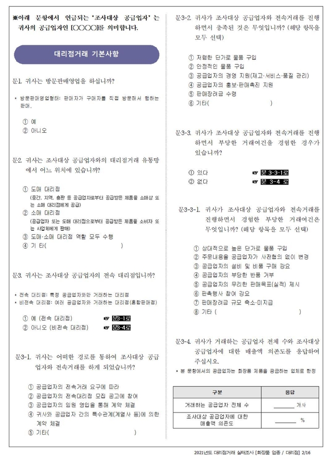이어 "대리점거래는 업종별로 이질적인 특성을 가지고 있기 때문에 단순한 업종 간 비교는 대리점거래의 현실을 잘못 해석할 수 있다"고 덧붙였다.