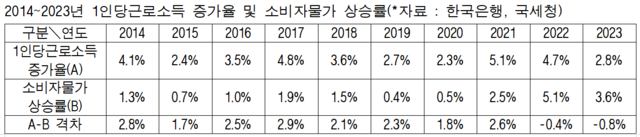 2023년 1인당 평균 근로소득 증가율 2.8%는 같은 해 소비자물가 상승률 3.6%를 밑도는 수준이다. 임 의원은 이같은 마이너스 격차(-0.8%p)는 최근 10년 새 가장 큰 것으로 근로소득자의 실질소득과 구매력이 대폭 하락했다는 것을 의미한다고 설명했다.