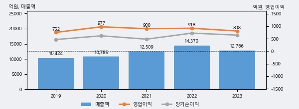 동원시스템즈의 2023년 매출액은 전년대비 -11.2% 줄어든 1조 2766억원이고, 영업이익 역시 전년대비 -12.0% 줄어든 808억원을 기록했다. 이 회사의 매출액 증감률과 영업이익 증감률은 각각 코스피 하위 24%, 하위 43%에 해당된다.