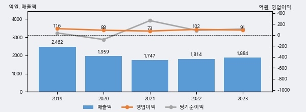 아시아나IDT의 2023년 매출액은 1884억으로 전년대비 3.8% 상승했고, 영업이익은 91억으로 전년대비 -11.0% 하락했다. 이 회사의 매출액 증감률과 영업이익 증감률은 각각 코스피 상위 41%, 하위 44%에 해당된다.