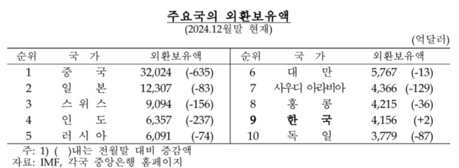중국이 3조2천24억달러로 가장 많았고, 일본(1조2천307억달러)과 스위스(9천94억달러), 인도(6천357억달러), 러시아(6천91억달러), 대만(5천767억달러), 사우디아라비아(4천366억달러), 홍콩(4천215억달러)이 뒤를 이었다. 독일은 3천779억달러로 10위였다.