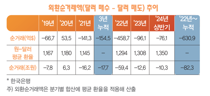 외환 당국 역시 대규모로 달러를 풀어 환율 방어에 적극적으로 나서고 있지만, 탄핵발 자본 유출 충격에 노출된 원환율의 가치 하락을 막아내기 어려운 게 현실이다. 한국은행의 분기별 외환순거래액을 보면, 2022년 –459억 달러, 2023년 –96억 달러, 2024년 상반기 –76억 달러로 환율 방어에 쓴 돈이 무려 631억 달러에 이른다.