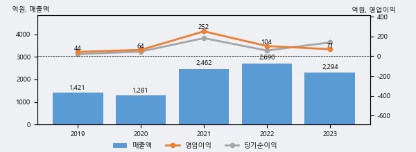피제이메탈은 2023년 매출액 2294억원과 영업이익 71억원을 기록했다. 전년대비 매출은 -14.8%, 영업이익은 -31.5% 각각 하락했다. 이 회사의 매출액 증감률과 영업이익 증감률은 각각 코스닥 하위 1%, 하위 1%에 해당된다.