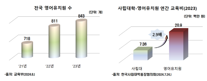 고가 영어 유치원은 이미 이십여 년 전부터 강남 등 몇몇 부촌 지역 사립 영어 유치원 쪽은 연간 수천만원대 비용을 자랑했다. 특강비, 특활비, 부재료비까지 합치면 실 부담은 더더욱 올라간다.