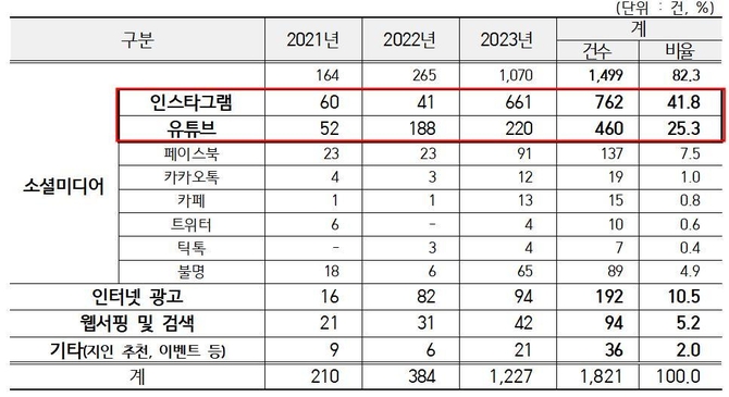 접속 소셜미디어별로 보면 인스타그램이 762건(41.8%)으로 가장 많았고, 유튜브가 460건(25.3%)으로 뒤를 이었다. 다음으로 페이스북 137건(7.5%), 인터넷 광고 192건(10.5%), 웹서핑과 검색 94건(5.2%), 지인 추천 등 기타 36건(2.0%) 순이다.