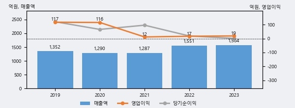 최근 실적을 살펴보면 2023년 매출액이 최근 5년 중 가장 높은 실적을 기록했음을 알 수 있다. 이전 최고 실적이었던 2022년 보다도 0.8%(12억 7천만원) 늘어난 것으로 나타났다.