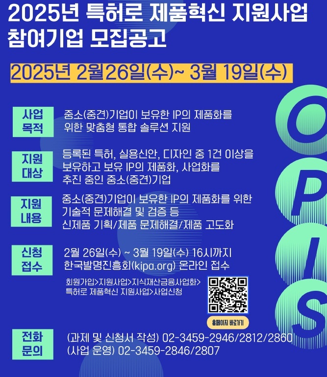 (조세금융신문=구재회 기자) 특허청은 오는 26일부터 다음 달 19일까지 '2025년 특허로 제품혁신 지원사업'(옛 IP-C&D 전략지원 사업)에 참여할 기업을 모집한다고 19일 밝혔다.
