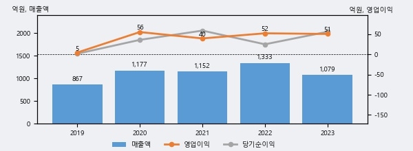 덕성은 2023년 매출액 1079억원과 영업이익 51억원을 기록했다. 전년대비 매출은 -19.0%, 영업이익은 -3.0% 각각 하락했다. 이 회사의 매출액 증감률과 영업이익 증감률은 각각 코스피 하위 12%, 하위 48%에 해당된다.