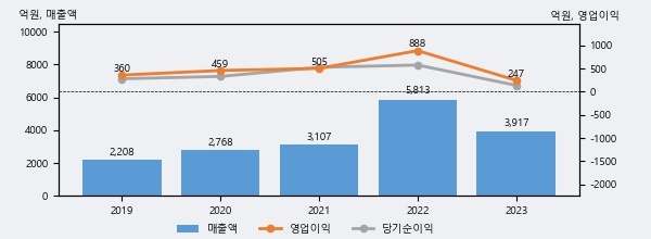원익머트리얼즈는 2023년 매출액 3917억원과 영업이익 247억원을 기록했다. 전년대비 매출은 -32.6%, 영업이익은 -72.2% 각각 하락했다. 이 회사의 매출액 증감률과 영업이익 증감률은 각각 코스닥 하위 11%, 하위 27%에 해당된다.