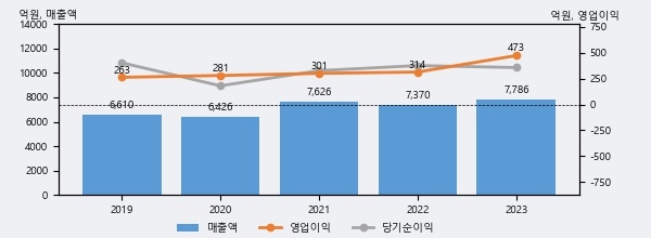 최근 실적을 살펴보면 2023년 매출액이 최근 5년 중 가장 높은 실적을 기록했음을 알 수 있다. 이전 최고 실적이었던 2021년 보다도 2.1%(160억원) 늘어난 것으로 나타났다.