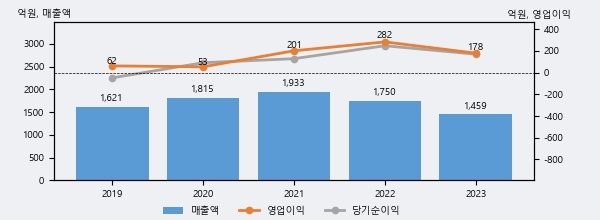 제주반도체의 2023년 매출액은 1459억으로 전년대비 -16.6% 하락했고, 영업이익 역시 178억으로 전년대비 -36.8% 하락했다. 이 회사의 매출액 증감률과 영업이익 증감률은 각각 코스닥 하위 24%, 하위 40%에 해당된다.