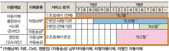 자동이체통합관리시스템은 10월 중 자동납부 변경 및 고객 동의자료을 열람할 수 있도록 해 줄 예정이다. 통신, 보험, 카드사 등 대형 요금청구기관에 대한 자동납부부터 변경서비스를 시작하고 요금청구기관의 범위를 지속· 확대한다는 것이다.