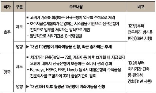 금융선진국이라 할 수 있는 영국, 호주 등에서 실행되고 있는 계좌이동제가 국내에서도 은행 간의 경쟁 촉진의 목적으로 시행된다.